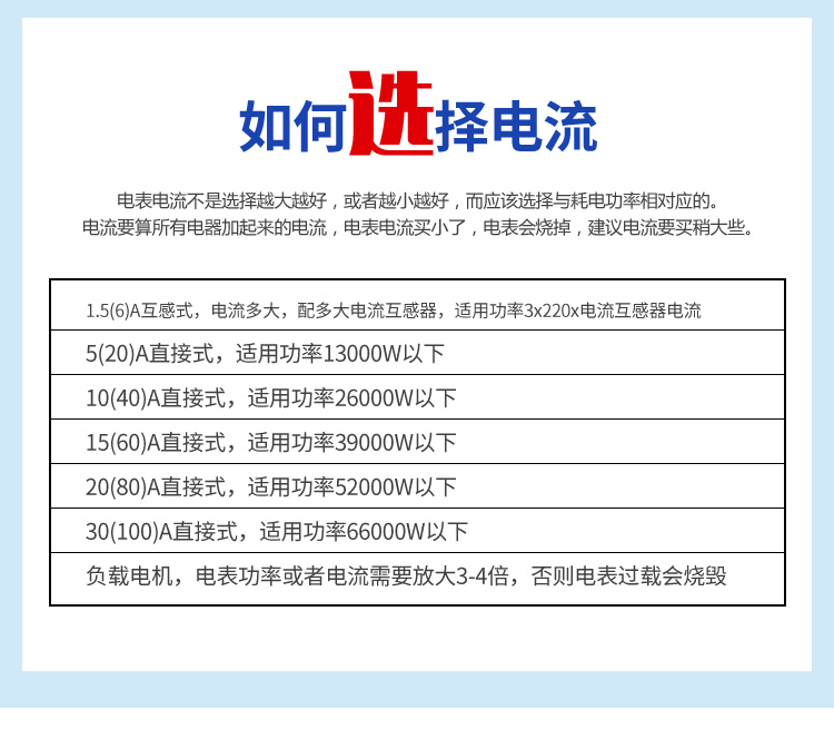 (五)三相預(yù)付費(fèi)電度表(公用表)的選型:電表電流不是越大越好,或者越小越好,而應(yīng)選擇與使用功率相對應(yīng)的預(yù)付費(fèi)電表,具體如下